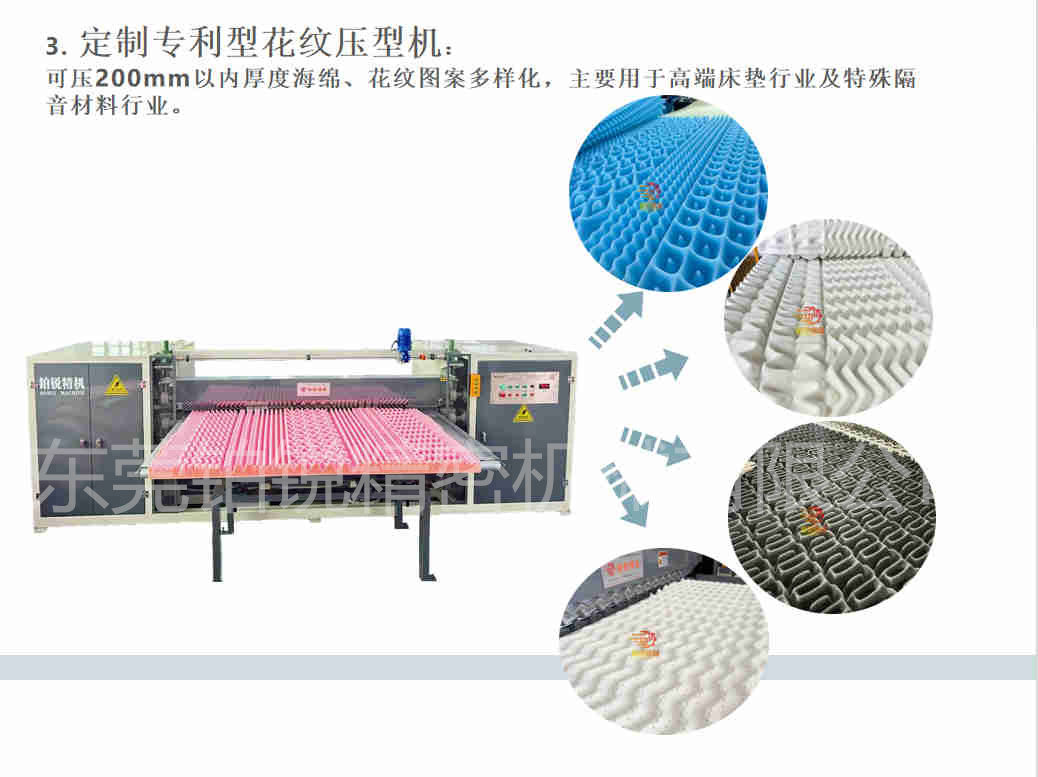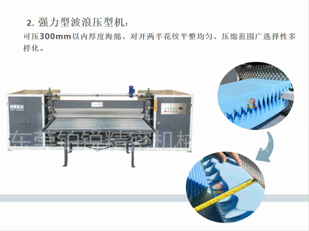 你知道这些波峰棉产品是怎么生产出来的吗?首先波浪棉的用途非常广泛,常用于海绵床垫、汽车座垫、橡塑隔音卷棉、汽车吸音减震垫、隔音降噪、电子包装、保健用品、精密仪器、清洁等行业。本机主要是将一块泡绵对开成二片一模一样的片材,厚薄均匀,花纹平整美观。东莞铂锐精机的波浪压型机比较人性化,可根据自己需求选购,常规标准型波浪压型机可压150mm以内厚度海绵,强力型波浪压型机可压300mm以内厚度海绵,压绵范围广选择性多样化。定制专利型花纹压花机可压200mm以内厚度海绵、花纹图案多样化,主要用于高端床垫行业及特殊隔音材料行业。