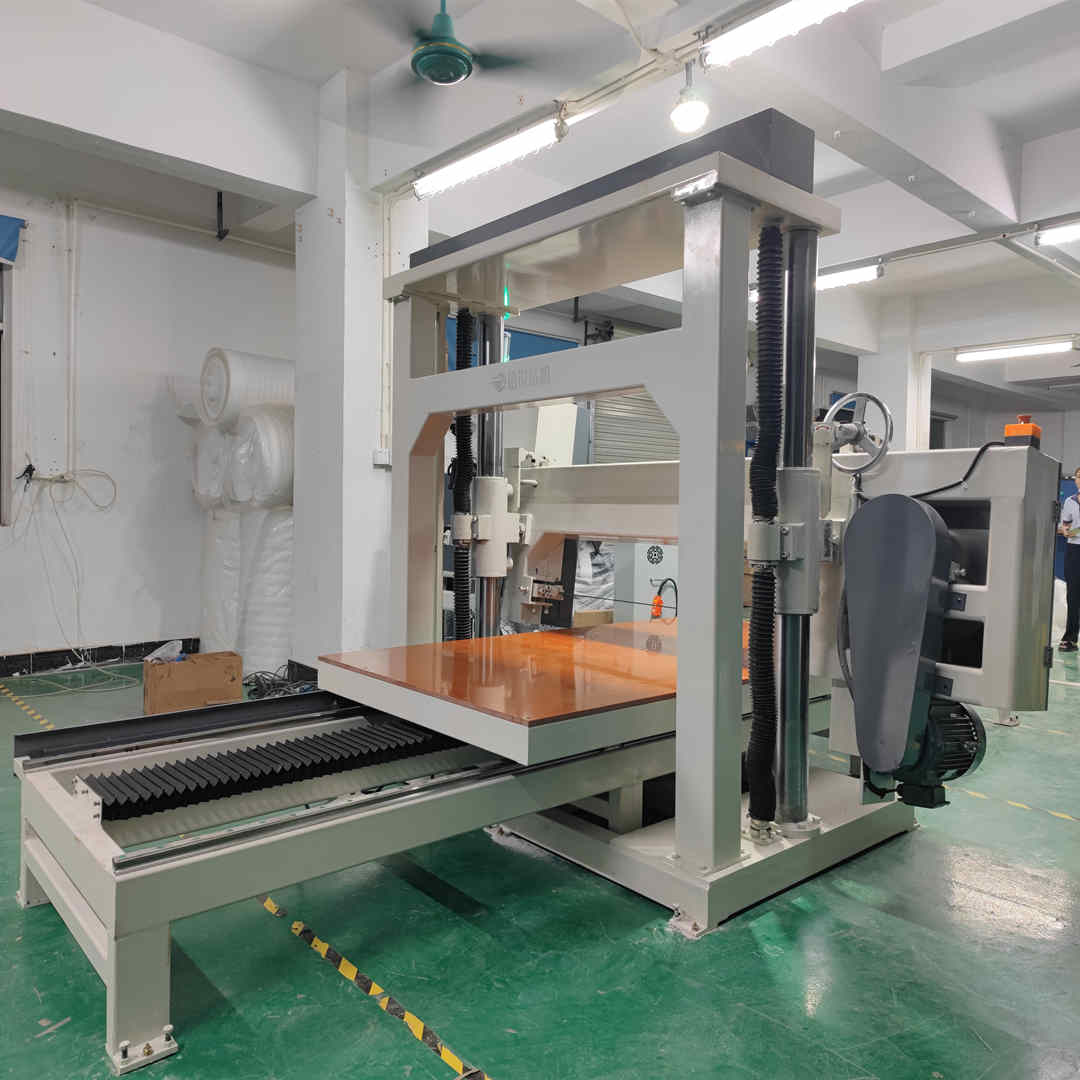 本机主要是把块状泡绵切成薄片,采用全自动数字控制,通过控制箱设定数值。工作台采用不锈钢板并带吸风装置。为了防止切割的泡绵滑动,可加压棍,操作简便,切割精确。