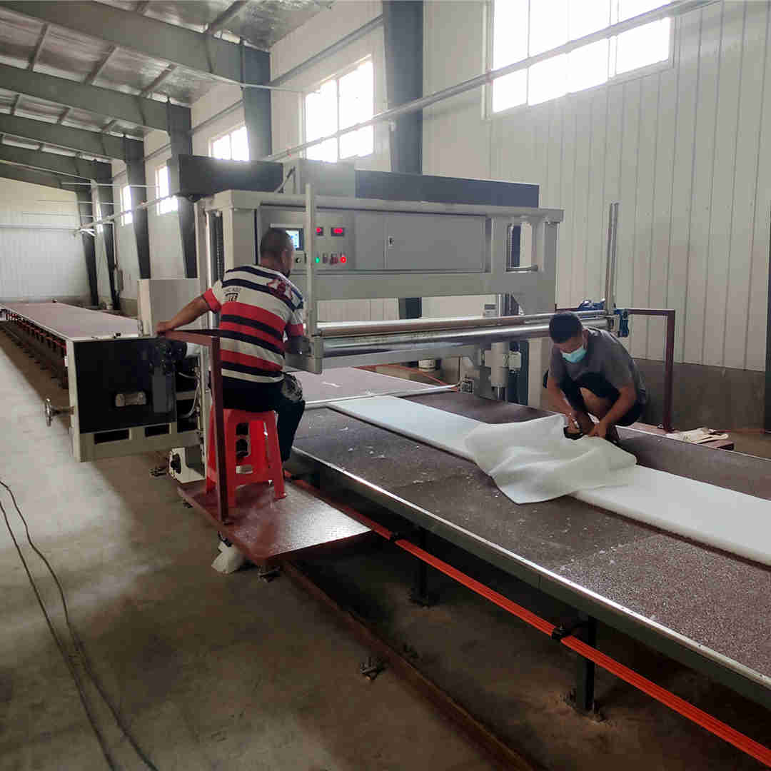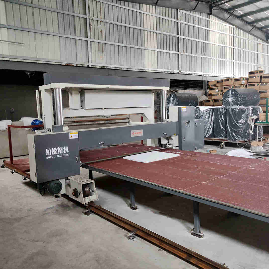 本机主要是把长块状泡绵切成薄片,采用全自动数字控制,根据需要切割的厚度和泡棉的密度,通过控制箱设定数值,机器在路轨上自动往返运动,运行平稳、生产效率高,是全自动流水发泡机的配套设备(本机可选配自动收料装置)